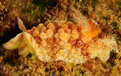 Large ovate dorid with broad mantle skirt. The mantle is covered with rounded tubercles of varying sizes. The tubercles have a rather characteristic shape with a rounded terminal knob, then a narrower waist and then a basal stalk which itself widens to about twice the width of the 'waist' at its base. The background colour of the mantle is a translucent watery brown with scattered dark brown patches. I some animals the patches coalesce so that much of the background is a dark reddish brown. The tubercles usually have a dark purplish knob, while the basal stalk is a translucent watery brown, often with an opaque white ring around the base. Species of Carminodoris are characterised by the possession of jaws, denticulate outer radular teeth, a large prostate gland, and an armed penis. C. armata lacks the denticulate radular teeth but its name armata refers to its penis which is armed with many hooks. See Carminodoris bifurcata.