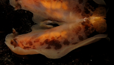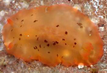 I recently photographed the acompanying two Dendrodoris fumata under a jetty near Rockingham in Western Australia. Nearby I found the third slug which puzzled me. I then found out that D. fumata comes in a variety of colours. This orange one was the same size as the pair of black ones, but is is possible that it is a colour form of D. fumata?