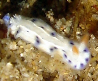 This was also found by Graham Abbott in September in 4-5 ft of water on a silty bottom (as shown in the picture) in a channel where the tide flows in and out quite swiftly - it is predominantly a sea grass area but there are isolated coral heads and patches of sponges. L: 8 mm. Photo: Lindsay Warren.