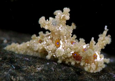 Body is typical in shape for the genus. It is spiculate and rigid with numerous spiculate tubercles, each with a large flattened tip. The rhinophores are smooth and rod-like and emerge from a prominent raised sheath with 3 -5 large tubercles around the opening. The gills also are protected by a raised gill sheath which is divided into three multituberculate branches. The animal is translucent brown in colour with scattered spots and patches of white. There are also bright blue spots arranged in a symmetrical pattern over the body. Most of the spots are surrounded by a broad orange-brown ring. It grows to approx 20mm in length. On its food sponge it is very well camouflaged. In Europe it feeds on the calcareous Leucosolenia botryoides.