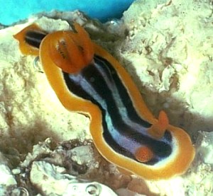 One of a group of similarly coloured species. It has a thin pale, almost white band at the mantle edge then a broad band of orange. Inside the orange there is a thin white band which becomes broader around the anterior end. In the central region there are three broad black bands and two thinner dirty blue lines. The gills and rhinophores are translucent orange. I will try and find time to prepare a comparative page on the 'Chromodoris quadricolor colour group'.