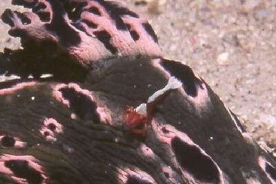 Here's a photo taken at Cabbage Tree Island, off Port Stephens, NSW, at Easter, 1999. Depth: 8m. Sandy Bottom. It's a rather large specimen, close to 10cm, with - as you can see - a commensal shrimp living on it. The pink colour is actually fluorescent (if that's the right word) in the sense that it appears a very bright red to the diver's eye under natural light. When I got the slide developed I was actually quite disappointed how drab it looked. I haven't been able to find the species in any book; my amateur guess would be that it's some Nembrotha or Tambja.