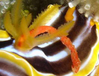 To get back to the egg mass. Have a look at the Fact Sheet on these egg masses, and also look at Scott Johnston's message [#3443] showing C. elisabethina laying an egg ribbon on a red sponge. This type of egg ribbon is much more difficult to see than the normal upright spiral of other dorids. Gohar & Soliman (1967) also reported a similar egg ribbon for C. aspersa (as C. inornata). It would be great if you could find such an egg ribbon asit would be good to confirm their observations.