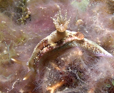This is Hypselodoris krakatoa, 'krakatoa' being a very appropriate reference to the volcano-like gills and gill pocket as you can see in the photo alongside. The photos show animals on the same sponge, a species of Euryspongia. The sponge looks quite different in the photos from the different localities because in the upper (and lower) photos the sponge has been almost entirely eaten and only the fibrous 'skeleton' remains, while in the middle photo the two animals have not eaten much of the colony.