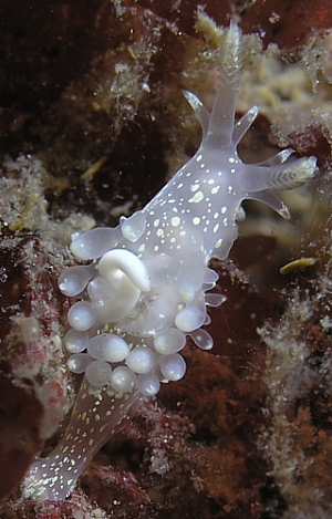 For those of you not familiar with copepod parasites in nudibranchs, have a look at the parasite page for some links. In Jan's photos, the large curved white 'sausages' are the egg sacs of crustacean parasites, the body being inside the nudibranch.