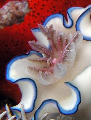 Even though the chromodorid nudibranchs are some of the most spectacularly coloured animals, and I have seen many of them, I can still be amazed when I see a new colour pattern. I am pretty sure this is an unnamed species. The only other one with blue on the edge of the mantle is Glossodoris cincta, and I am sure it is not a form of that species.
