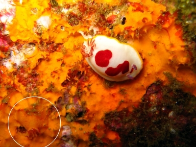 You are right! This is another interesting find - the first information on the food sponge of Noumea laboutei. As I suspected from its camouflage coloration it appears to feed on a yellow-orange darwinellid sponge.