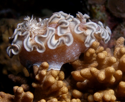 Here is a Glossodoris hikuerensis posing on hard coral. It seemed disturbed by either my close presence or by my strobe light (?). It coiled its body inwards then moved away very slowly.