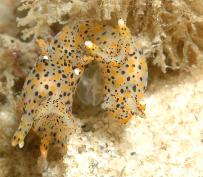 We found these Thecacera pennigera mating. They seem to be on their food. Thought these shots might be of interest. Water Temperature: 19 degrees celcius