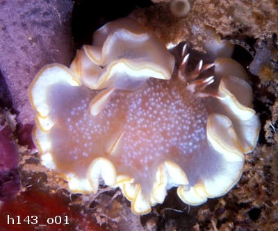 Middle: h143-o05 24mm. Pupukea, Oahu, Hawaiian Islands. In ledge at night. Depth 12m. 29 June 1983. Animal not disturbed, but appeared to be feeding on yellow sponge.