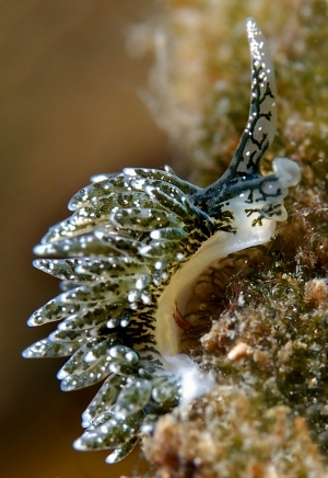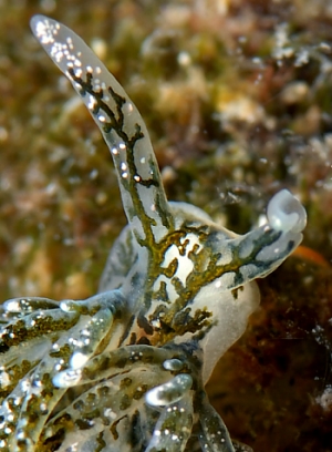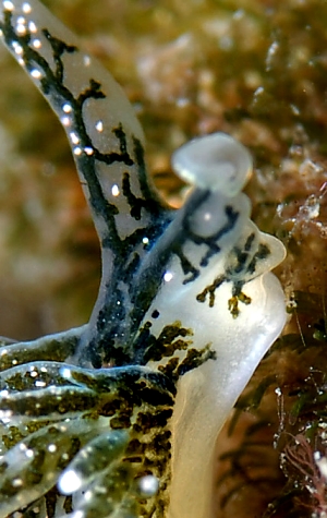 In your photos we can see the white-tipped cerata and the concentrtaions of white spots? glands? in the upper half of the rhinophores. The close-up alongside nicely shows that the rhinophores are not a solid tentacular structure but are enrolled. The green branching in the body is the digestive gland - the green being chloroplasts obtained from its algal food.