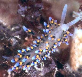 The overall body colour is translucent white with fine white speckling towards the front which also features on the quite long, simple rhinophores. The cerata down each side of the body which come together at the posterior end are quite distinctive with black and orange internal areas and blue tips. Two small eye spots are visible close together behind the rhinophores and there is a larger black spot further back on the notum.