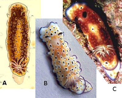 "Several specimens from the East and West Coasts of Zanzibar. The following are the notes on the living animal:- Colour yellowish white, with indefinite large drab blotches laterally. Edges of mantle and foot bordered with light violet. On the back are black spots surrounded by a white line and also irregular dull orange spots. The foot is not very broad, white in colour, with a row of dull orange spots and black spots below them. The tip and anterior side of the rhinophores are purple; the lamellae are reduced to fine striations"..... Eliot, 1904