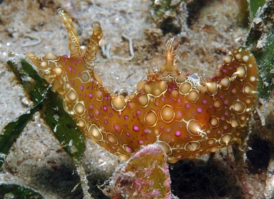 We found what we think is Petalifera ramosa laying eggs. If you look carefully you can see the start of an orange zigzag of eggs under its mouth. It was one of those photos that we didn't see what was going on until we put it on the computer screen. This Petalifera ramosa was hunched up so it didn't make a good shot and there were lots of others that looked like better photos to the naked eye. Because the egg laying wasn't particularly clear we didn't send it in earlier, thought it may have just been crawling over them. But we thought after seeing Ron Greer's shot with more detail that we should send it in as support to the theory that these are the type of eggs it lays. Now we know what we are looking for it will help. Mating photos show the head of one on the back of the head of another. Where do they lay eggs them from?