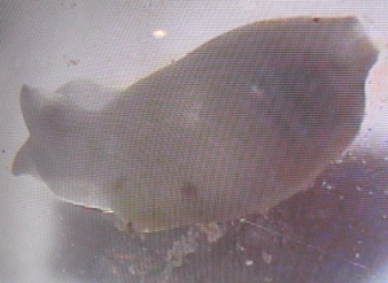 Thank you for the information. The approx. size is about 2 mm. Attached is a photograph of the animal taken from the TV display as we do not have a picture capture facility on the microscope. It is magnified about 150 times and we have cropped the picture. It has since died.