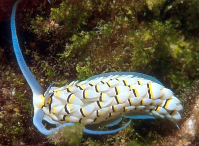 I finally came across another Cerberilla here in the Marshall Islands. I am assuming these are the same as the Cerberilla sp. 3 I sent a while back, although there are a couple of differences. It does not exhibit the black tips of the cephalic tentacles seen in the earlier specimens from Enewetak and Guam. The new specimen also has much more distinct yellow bands above the black ones on the cerata, providing a bit more evidence that it may be C. annulata. This specimen was found in Kwajalein's harbor, crawling on sand at a depth of about 1 meter. It measured about 20mm, a bit over half the length of the Cerberilla sp. 3 sent earlier.