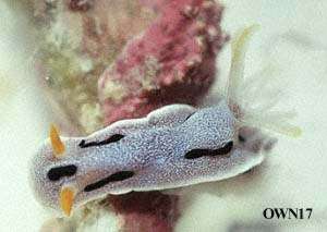 OWN21 - probable Ch dianae. Length: 3.2 cm. Found at a depth of 5m on a wall crawling on coralline algae. Only four tips of gill filaments were slightly orange and this could only be seen under the microscope. There were also some black dashes on the outside of the gills.