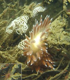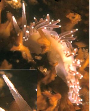 On the lower left photo the inset is showing the white sreak on the rhinophore which is one of the external identification points of this species. The colour and shape of the head and head tentacles are important in identifying species of Flabellina but as your photos show, when these animals are busy looking for food they don't make it easy for you to photograph their important features.