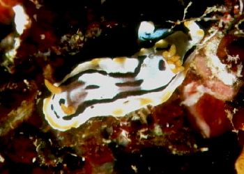 Here is a Chromodoris michaeli one from the Philippines, Cebu Island, Moalboal, divesite "housereef", depth 10 m, length about 3 cm, May 2000. This photo was taken by Georg Heinze and identified by David W Behrens. I think it looks like the one I recently sent to you.