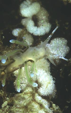 The photos were taken in Woods Hole, Massachusetts, USA under the Woods Hole Oceanographic Institute's pier in about 4 meters of water. I spotted a hydroid covered with eggs and easily found a number of E. olivaceus. They were all about 9 mm long.