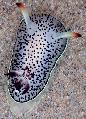 Mantle covered in tapering papillae. They are translucent white and sometimes tipped with black. There is a range in variation from those animals in which most of the papillae are black-tipped to those in which none are black-tipped. The edge of the mantle and the foot has a milky crean-yellow border and the mantle also an inner black line. This species grows to 30mm long.