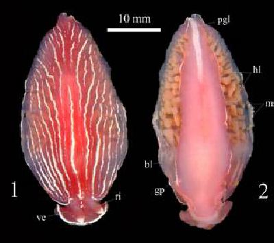 The living animals are bright red in color with contrasting white longitudinal notal ridges; the anterior margin of the oral veil and the apical portion of the rhinophores are also white (Figure. 1). The body is elongated, flattened, narrowing posteriorly. The notum bears 34 longitudinal dorsal ridges, the oral veil is distinct and the club-shaped rhinophores, bear about 10 vertical lamellae. A caruncle is also distinguishable in front of the rhinophores. The genital opening is located on the right side, anterior to the branchial lamellae. There were approx 20 branchial lamellae on each side of the body, and 15 hyponotal lamellae. A deep medial groove is present along the sole of the foot (Figure 2) and the posterior white pedal gland is prominent. The radula has the formula 27 X 32.1.1.1.32 (holotype) (Figure 3). The rachidian tooth is broad (112 µm) and bears 12 elongated denticles on either side of the median cusp (Figures 3 and 4). The first lateral tooth is short, bulky and denticulated on the outer side of the cusp. The remaining lateral teeth are elongated and also bear denticles which become progressively smaller towards the marginal tooth rows (Figure 5). The jaws have a denticulated masticatory border (Figure 6), and a long masticatory process (Figure 7). Each process bears four rows of denticles (Figure 7).
