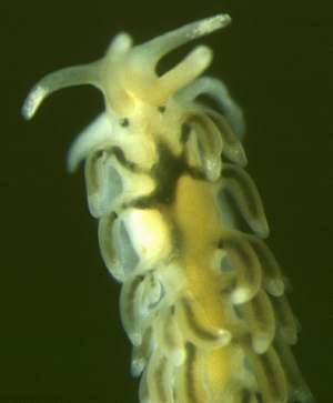 The two species do however differ consistently in some morphological characters. In body length and width, C. glaucoides is wider and longer. The position of the kidney differs between species, being between the 2nd and the 6th (rarely 5th or 7th) ceratal group in C. glaucoides and between the 2nd and the last ceratal group in C. gobioophaga. The size and position of the eyes also differs, being about 80 µm, and positioned behind the rhinophores in the space between these and the first group of cerata in C. glaucoides, and 110 µm, and immediately behind the rhinophores in C. gobioophaga. The form and size of the propodial tentacles also differs, being small and acute in C. glaucoides and large and finger-like in C. gobioophaga.