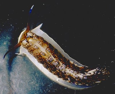 The colour is known from only two specimens, one described by Eliot (1903) from Zanzibar, and the animal photographed here from nearby Dar es Salaam. The body is translucent white with a brownish dusting over the head and up the oral tentacles where it merges into a blue band and a translucent white tip. The rhinophores are translucent white with a blue band, and on the outside of each rhinophore, there is a brown ring on the head surrounding a large white patch. The ceratal colour changes depending on the size and position of each ceras but the following succession of colour bands up the cerata is fairly uniform, except the width of each band can chnage. The basal band ranges from whitish grey to green or dark brown, and above this is a thin band of dark brown or black. Above this is a thin white band which can be bright yellow or brownish orange in the longer cerata. Above this the cerata are blue, the colour varying from a pale greyish blue to a bright blue.