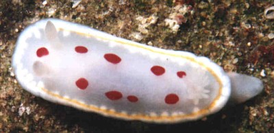 Translucent white mantle and body, with white rhinophores and gills. Irregular opaque white band around mantle edge formed from ramifying epithelial mantle glands. In some specimens there is a thin submarginal yellow line around the mantle on the inside edge of the mantle glands. It apparently does not continue around in front of the rhinophores. Most specimens have a sereis of large red spots on the mantle, but in a few cases these are absent.