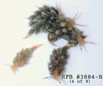 The most distinctive feature of this species appears to be the bright blue, or white spot on the upper side of each ceras. The spot is sometimes surrounded by a dark green ring. Ther can be a similar mark behind the eyes in the dorsal midline, but this can lack the ring, and be reddish in colour. A reddish subapical band can also be present on the cerata. It grows to about 10 mm and is found on the green algae Avrainvillea.
