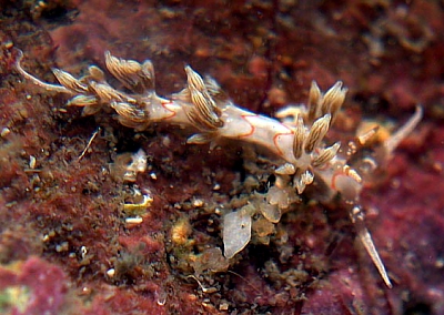 Relatively small glaucid aeolid with anterior cluster of cerata on each side arranged in a single arch, while the cerata behind the heart are arranged in single sloping rows. The oral tentacles and rhinophores are smooth, tapering to a rounded point, and the anterior end of the foot is extended on each side into tentacular foot corners. The body is translucent clear with some white spots and patches, and a most characteristic pattern of curved thin orange lines. On the head there is an orange inverted V-shaped mark running forward from each rhinophore, and behind the rhinopores is an orange line running back from the base of each rhinophore and they curving in to meet in the midline. Down the body, in the space between the ceratal clusters there are similar pairs of orange lines. The ceratal wall is marked with a band of vertical white lines, which are quite obvious when the digestive gland is a dark brown colour.