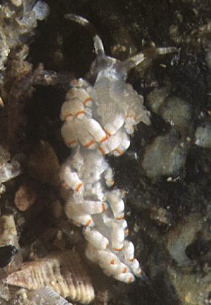 The rhinophores are relatively long with a number of irregular semi-circular plates arranged along their length. The body is translucent white with opaque white mottling. The oral tentacles are translucent clear with two broad white bands, one in the upper quarter the other in the second quarter from the base. Between these white bands the translucent region is pigmented with yellow-orange, which is clealry visible in some lights and apprently absent in others. The cerata are also white or translucent with broad white bands, and there is a yellow-orange band near the tip. This semicircular plates on the rhinophores and the yellow band on the cerata seem to be characteristc of this species.