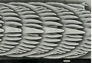 LOWER: Scanning electron micrographs of the radula of an animal from Broadhurst Reef, off Townsville, North Queensland. Scale bar = 10 microns. Photo: Geoff Avern.