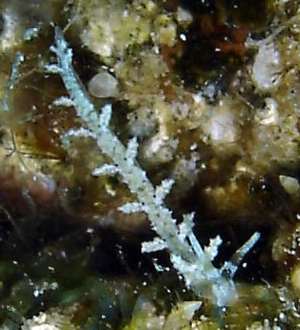 This species was described from a single preserved animal, 6mm long, and an accompanying colour photo. It was diagnosed as "body narrow, creamy white with longitudinal beige band, covered with tubercles; eight pairs of tuberculate cerata without pseudobranchs, simple rhinophore sheaths and digitiform rhinophores." In the fuller description the body is described as long. the cerata are irregularly tuberculate, and there are numerous white tubercles scatterd over the dorsum and sides of the body. Since the description was based on a single specimen we know nothing about this species variation in colour or shape. However it is most probable that this record from Benjamin Koretz [#15715 ] is Doto orcha. The animal illustrated here is proportionally much longer than Yonow's, but I don't know if that is just because it is crawling and Yonow's was at rest on a hydroid. The cerata are proportionally much smaller compared to the size of the body than in Yonow's. Also, Yonow described a distinct beige band down the dorsal midline, which is absent in Koretz's animal, which also shows a distinct dark spot at the inner base of each cerata.