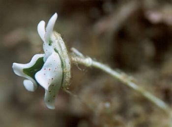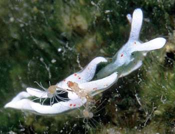 Upper: Elysia timida feeding on an Acetabularia. Baie de Peyrefitte (French / Spanish Mediterranean border), depth 2m, 23 September 2000. Photo: Patrick Heurtaux.