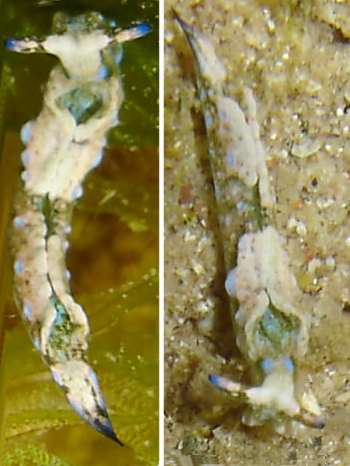 Last month, I sent you a couple of poor photos of what looked like a small Elysiid sp. [message #13166], which as yet you haven't posted. We have encountered this slug several more times in the same vicinity, and now we have some halfway decent photos.