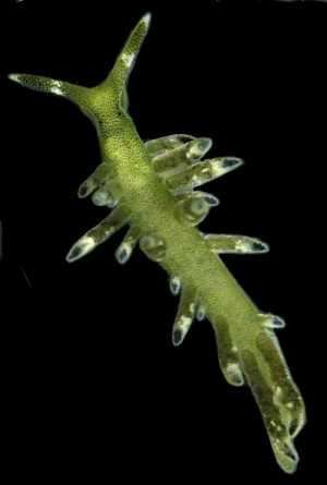 Living animals from Lizard Island, Nth Queensland, Australia. Upper: Animal after 2 hours in giant cell of Boergesenia. Lower left: Animal after 4 days starvation, length approx 3 mm. Lower right: Animal just removed from algal cell, length approx 5 mm. Photos with permission from Grzymbowski, Y., Stemmer, K. & Wagele, H, (2007).