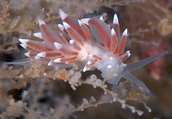 Body color is translucent white. The cerata are relatively swollen and there are two known colour forms, one with a reddish digestive gland clearly visible through the transparent ceratal wall, and another with a pale brownish white digestive gland. The tip of each ceras is opaque white. Found on the hydroid, Sertularia. To 6 mm. San Juan Island, Washington.