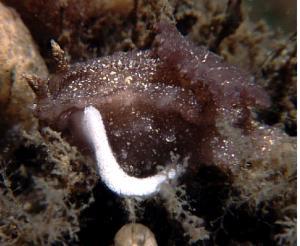 The mottled brown and white colouration are usually an effective camouflage. Often found partially buried in a hollow which they excavate in the ascidian colony on which they are feeding. Normal foor ascidians are Botryllus schlosseri and Botrylloides leachi. Can grow to about 40mm long. See Peter van Bragt's message below for more photos, including one of animal on Botrylloides leachi.