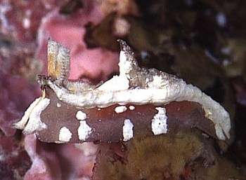 The colour is quite distinctive with an opaque white head and dorsum and gills with a few dark brown patches. The sides of the body are translucent clear with some brown and white mottling. It grows to at least 20mm in length.