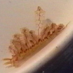 Feeds on red algae Griffithsia, Delesseria, and Heterosiphonia. Reported to have a distinctive smell, likened to the Geranium plant and sulphuric acid, by different authors. Grows to about 20mm.