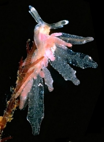 Little is known about this species apart from its original description, based on 3 specimens from Western Australia. The animal is almost transparent, with the body organs showing through the skin. Fine red specks are scattered over the skin and slightly larger white glandular dots are also present. Sometimes the white can form larger clusters as on the rhinophore tips and and on the cerata. The animals usually have an overall pinkish tint which is accentuated when the branched digestive gland in the cerata is full of recently ingested cell contents from the red algae thay feed on. The body is quite slender and the cerata are arranged in two or more rows down each side [not one as in original description], and the cerata range in size from quite small to very large. In my experience, cerata are autotomised very easily, which could explain the differing accounts of ceratal arangement.