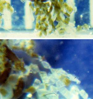 Upper: Hermaea vancouverensis found on Neorhodomela larix. Middle: red alga Neorhodomela larix. Lower: chain forming diatom Isthmia nervosa which lives attached to Neorhodomela - note mm scale in upper part of photo. Oregon, USA, NE Pacific Ocean, mid-1980s. Photographer: Cynthia Trowbridge.