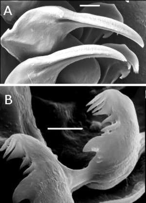Upper: Gau Tau (N), Mirs Bay, 5-12 m, Hong Kong, April 1983, AM C139137. Photo: B.W. Darvell. Lower: SEM of radula showing two large inner lateral teeth and two outer laterals, on the right side (A) and a close-up of two outer lateral teeth (B). A, Tai Tam Harbour, Hong Kong , 24 February 1984, 0.5 m, AM C141494. Photo: G. Avern. B, Kiu Tsui Chan, Port Shelter, Hong Kong, 4–7 m, February 1984, AM C141495. Photo: A.C. Miller. Scale bars = 10 µm.