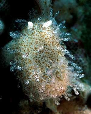 Like Okenia plana, the colour of the body and its round flattened body make it very well camouflaged on its bryozoan food. Okenia pilosa differs from O. plana in having many more of the finger-like lateral papillae. The animals are about 10 mm long and feed on encrusting bryozoan colonies on which they are found. Bouchet & Ortea, (1983) report this species feeding on an encrusting bryozoan, Calpensia sp. Originally placed in the genus Hopkinsia, a recent review (Gosliner, 2004) can find no grounds for keeping that genus distinct from the earlier Okenia.