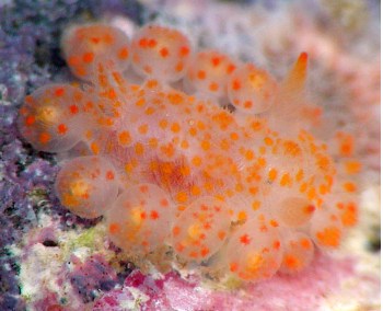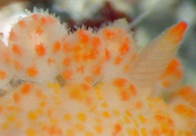 Small translucent animal covered in bright orange spots. Around the edge of the body are a ring of spherical stalked tubercles. Both the body and the tubercles are heavily spiculate. The tips of the lamellate rhinophores are also orange and the edge of the gills are spotted with orange. Originally described from Japan, it is also found on both the east and west coast of Australia. It feeds on encrsuting bryozoans.