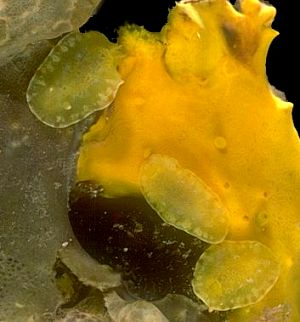 UPPER: Boat Harbour, Devonport, Tasmania; 1 specimen (16 mm long alive), 12m, 26 May 1985, AM C146610 - Holotype. LOWER LEFT: Horseshoe Reef, off Devonport, Tasmaania; 1 specimen (11mm long alive), 12 m, 19 February 1984, AM C141269. LOWER RIGHT: Warna Point, Louth Bay, Eyre Peninsula, South Australia; 8 specimens (5-7 mm long alive), 2 m, 11 February 1985, AM C145100. Food sponge is Darwinella sp. PHOTOS: Bill Rudman