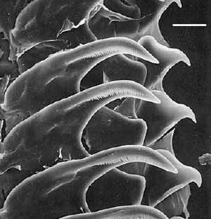 Upper: Sepok Point, Maricaban Island, Batangas Province, Luzon, Philippines. Lower: SEM of radula showing lateral teeth on right side (CASIZ 085883). Scale bar = 23 µm. [Photos from Gosliner, 2004 with permission].