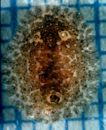 The ovate onchidorid, usually appears almost round when it is resting. It seldom grows larger than 5 mm in length but specimens can reach 10 mm. The mantle bears many small rounded tubercles.