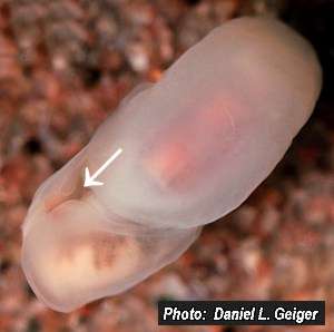LOWER photo - ventral view showing foot, which covers about the anterior two-thirds of the body length, and behind this the underside of the posterior shield, showing the opening (arrow) into the mantle cavity.